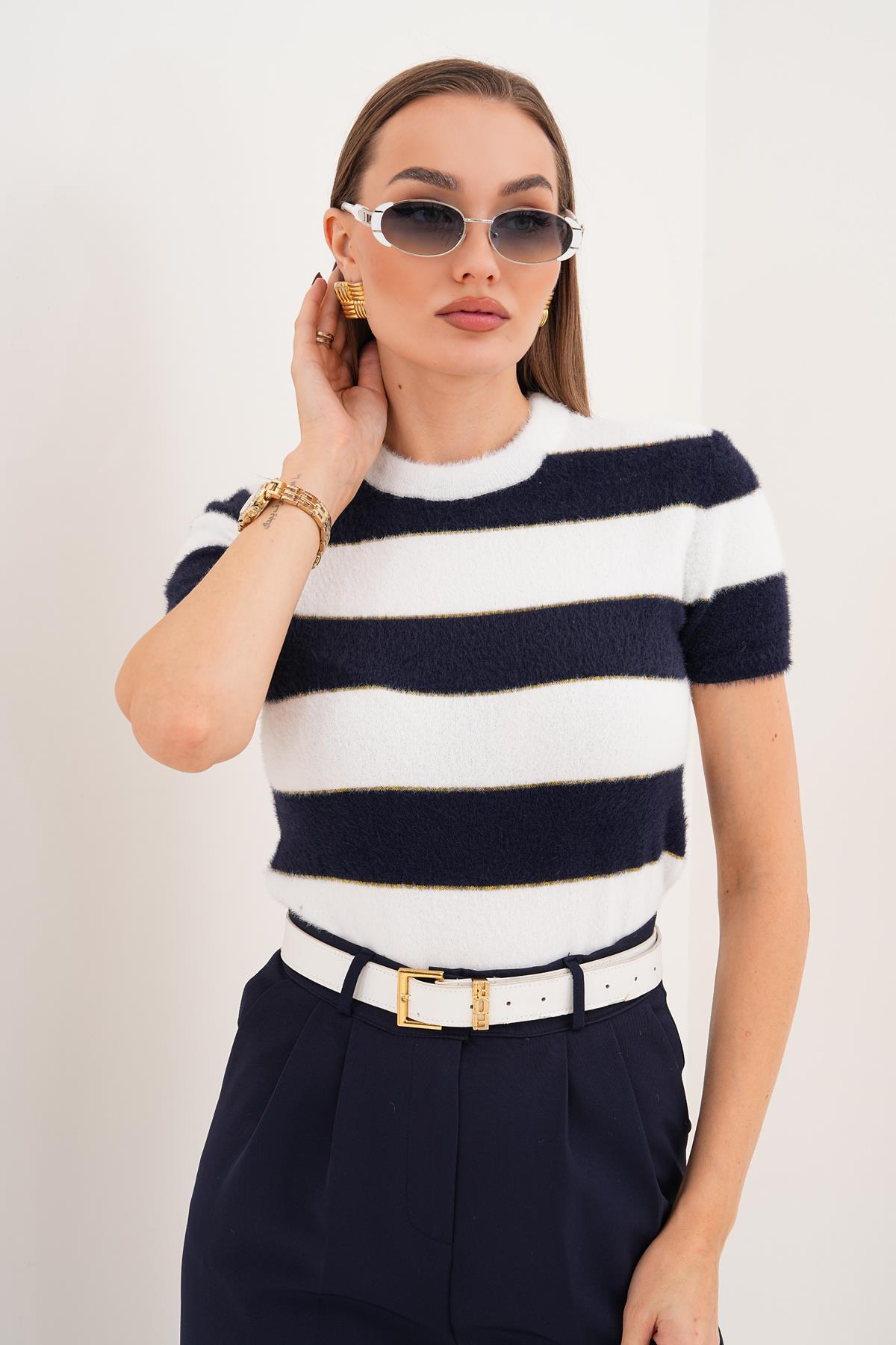 Kadın Çizgi Desenli Sakallı Kısa Kol Örme Kazak 255184 -