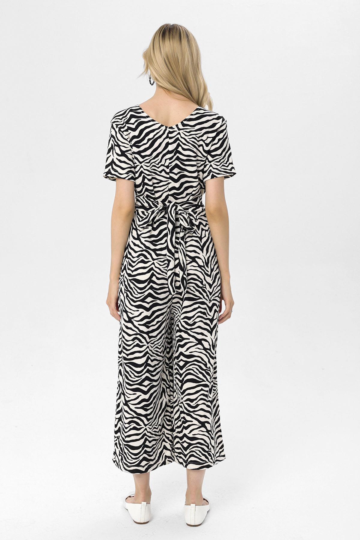 Kadın Desenli Kruvaze Yaka Kuşaklı Örme Tulum