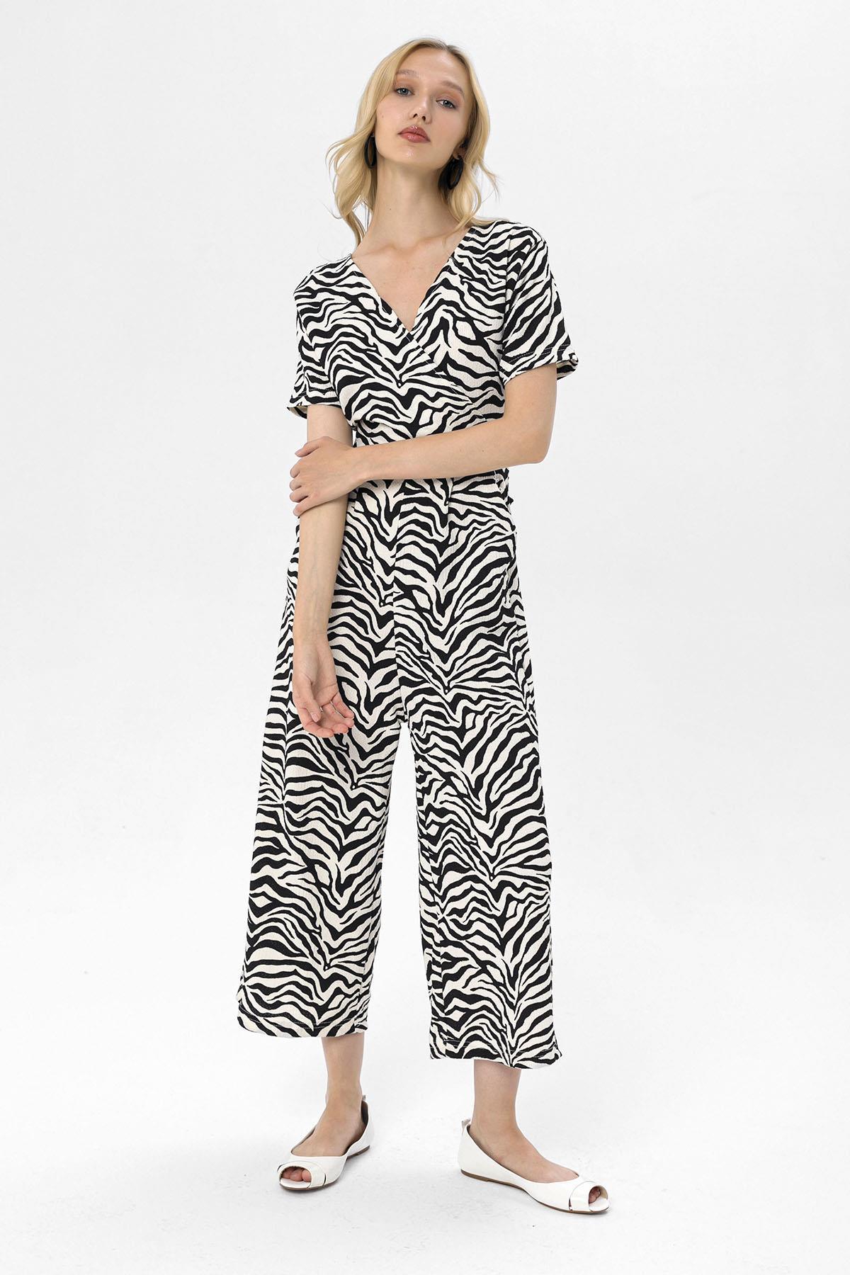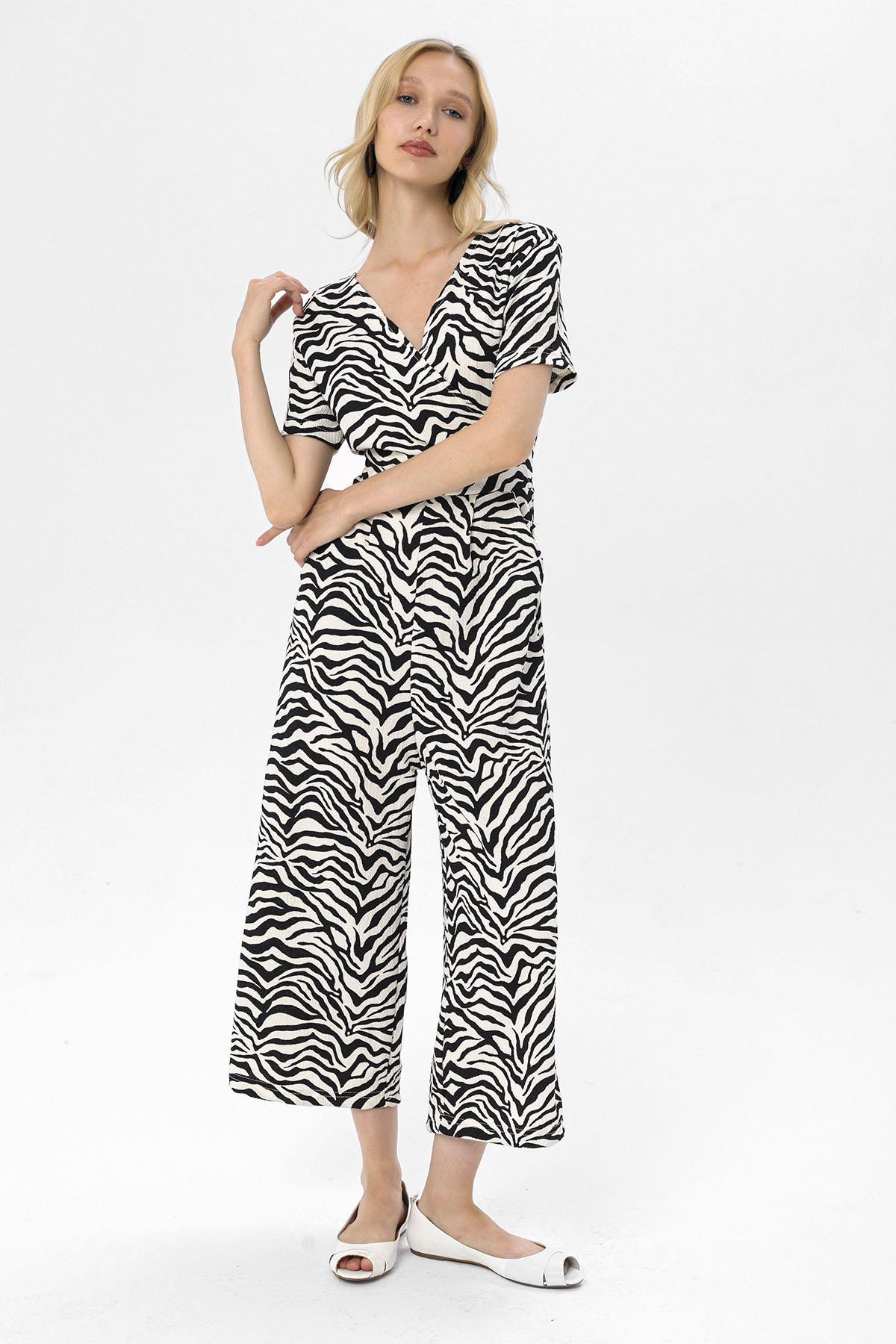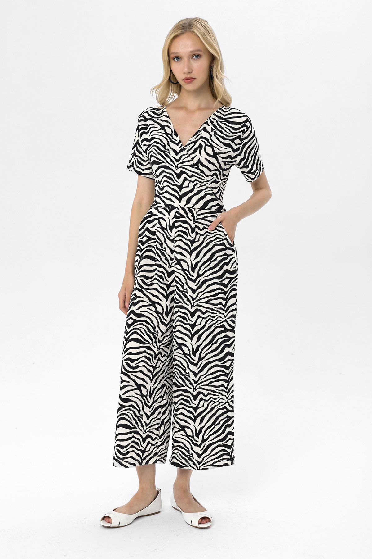 Kadın Desenli Kruvaze Yaka Kuşaklı Örme Tulum (220821)