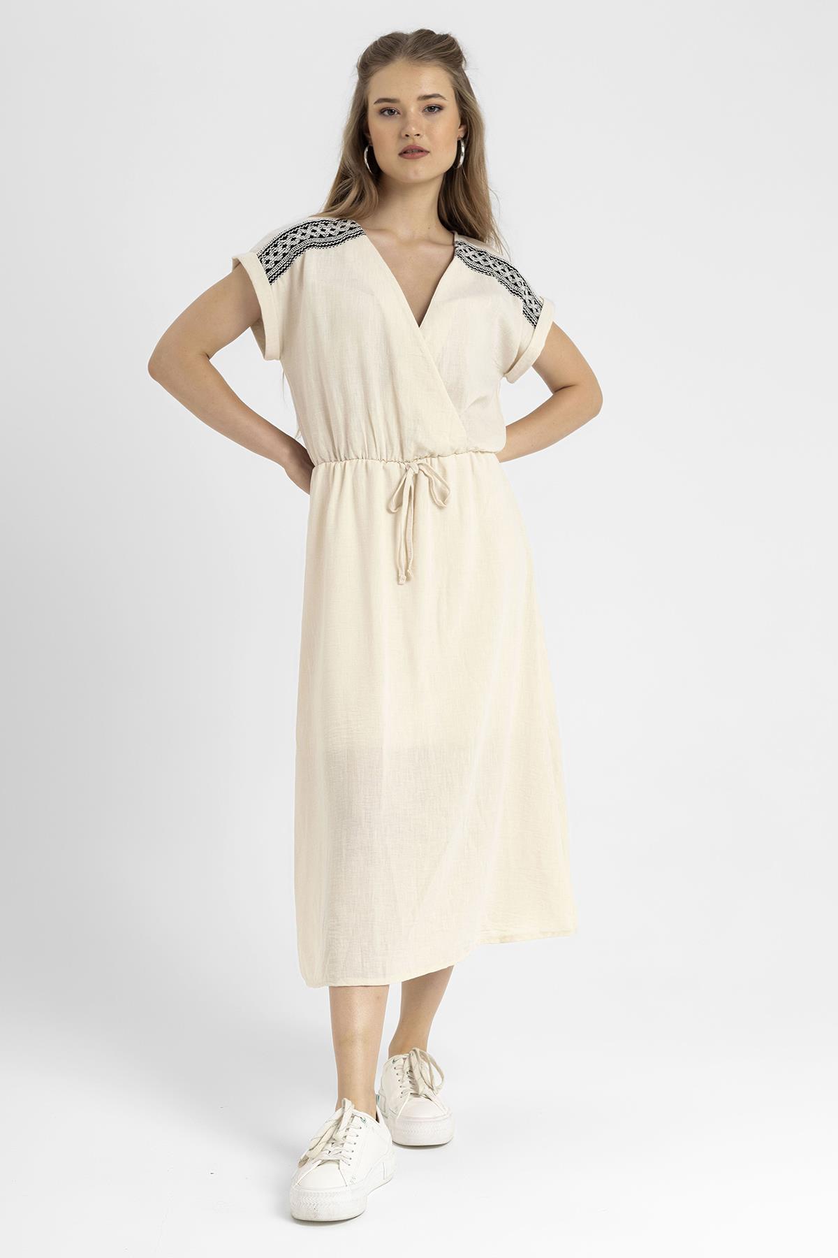 Kadın Omuz Nakış Detaylı Kruvaze Yaka Uzun Keten Elbise 240031 -