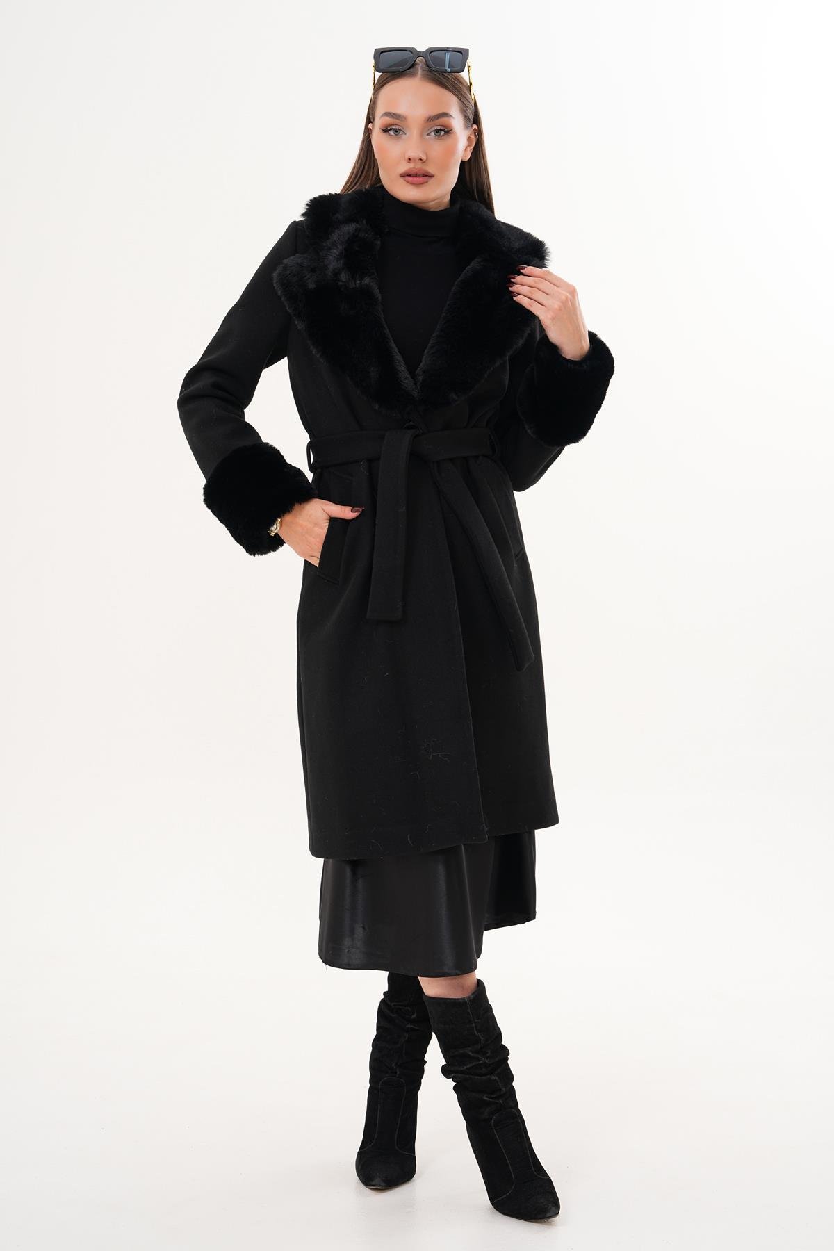 Kadın Yakası Kolu Tüy Detaylı Kaşe Kaban 255395 - (255395)